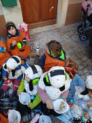 Den Klängen der Guggenmusiken zu lauschen und sich in eine kleine Konfetti-Schlacht zu stürzen, machte den Kindern grossen Spass. Zum Abschluss gab es auf dem Ildefonsplatz wie gewohnt einen feinen Risotto.