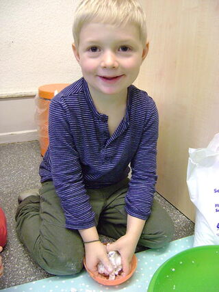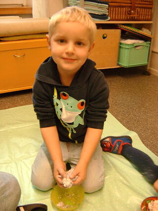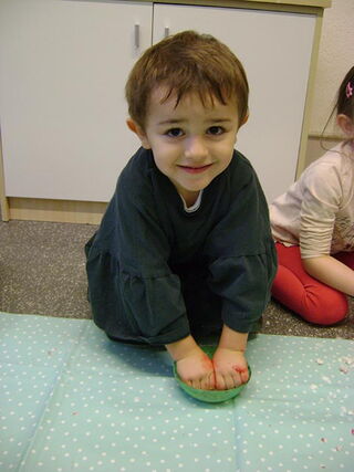 Die Kinder trafen fortlaufend ein und sassen in den Singkreis. Wir sangen solange, bis alle Kinder da waren und sangen als Abschluss alle gemeinsam ein Weihnachtslied. Nach dem Lied teilten wir die vielen Kinder in drei Gruppen auf. Wir teilten sie so auf, dass es ihren Bedürfnissen und Fähigkeiten gerecht war. Die kleinsten Kinder der Chinderstube durften in das Rhythmikzimmer mit Astrid und Sandra. Dort konnten sich die Kinder auspowern bis sie verschwitzt waren. Sie durften balancieren, im „Bällelibad“ baden und schöne Weihnachtmusik nebenbei hören. In den zwei anderen Gruppen waren die Grösseren. Bei Wala und Kaja hatten die Kinder farbige, klebrige und duftende Hände von der wunderschönen und selbstgemachten Seife. Die Kinder, die bei Serena und Larissa waren, hatten leimige und farbige Hände von den selbst gebastelten Weihnachtskarten. Während die Kinder bastelten, Seife machten oder sich ausgepowert hatten, wurde für uns gekocht. Aber diesmal war es nicht Nicole, sondern unsere zwei Gruppenleiterinnen, die eine andere Rolle einnahmen an diesem Morgen. Sie backten für uns leckere Wienerli im Teig und bereiteten Gemüse mit einer feiner Dip-Sauce vor.
